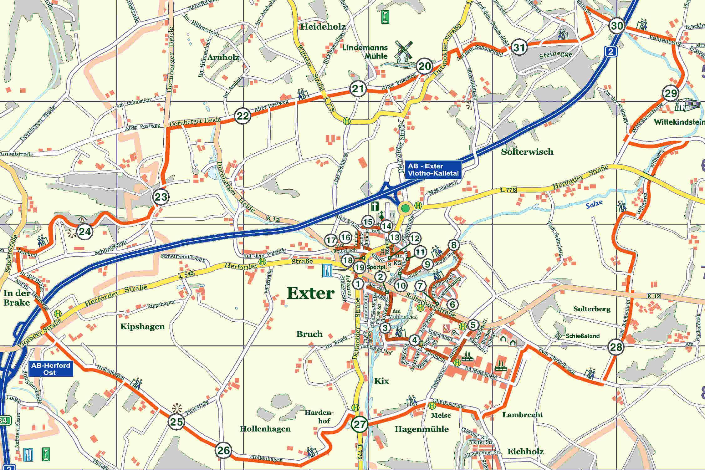 Die Exter-Tour erschließt den Ort durch die Innenroute (4,3 km lang mit 19 Stationen), sie führt durch den Ortskern (Start und Ziel am »Buswendeplatz« im Ortskern), die Außenroute (16,9 km mit 12 Stationen) führt über die Höhen rund um den Ort. Start und Ziel ist die Windmühle Exter am Alten Postweg. Stationstafeln bieten Kurz-Informationen, per QR-Code ist weiterführendes zu erfahren. Eine Faltkarte ist im Ort erhältlich, so lange der Vorrat reicht.